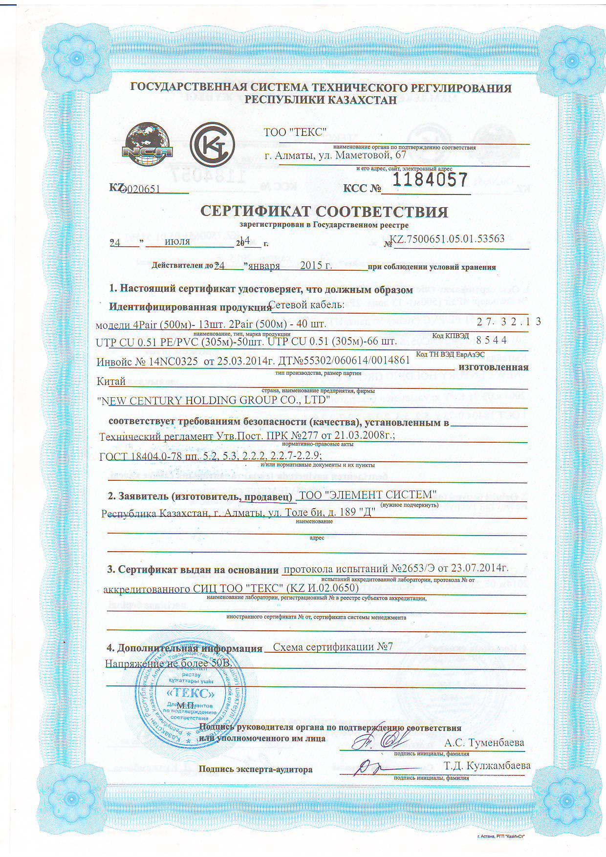 Сертификат соответствия от 14 июля 2014 №1184057